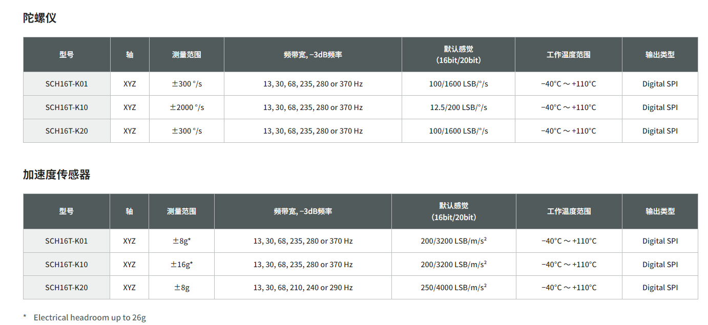 Acceleration measurement range of ± 16g (SCH16T-K10) or ± 8g (SCH16T-K01 and SCH16T-K20)
